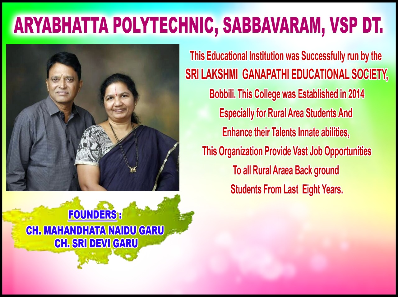 The Sri Lakshmi Ganapathi Educational Society was founded in 2007 by Sri Chandana Sridevi, Sri Chandana Mahandhatha Naidu, and their family members, with the aim of providing quality technical education to rural students. Led by Sri Chandana Mahandhatha Naidu's commitment to societal betterment through education, the society established Sai Krishna Polytechnic in 2009 at Bondapalli Village, Vizianagaram district, which has successfully educated thousands of technical students. Building on this success, they founded Aryabhatta Polytechnic in 2014 in SABBAVARAM, Visakhapatnam district, garnering popularity for its quality education to rural students. Currently, the society is planning to establish an ITI College in Sabbavaram, continuing their mission with the same dedication.
